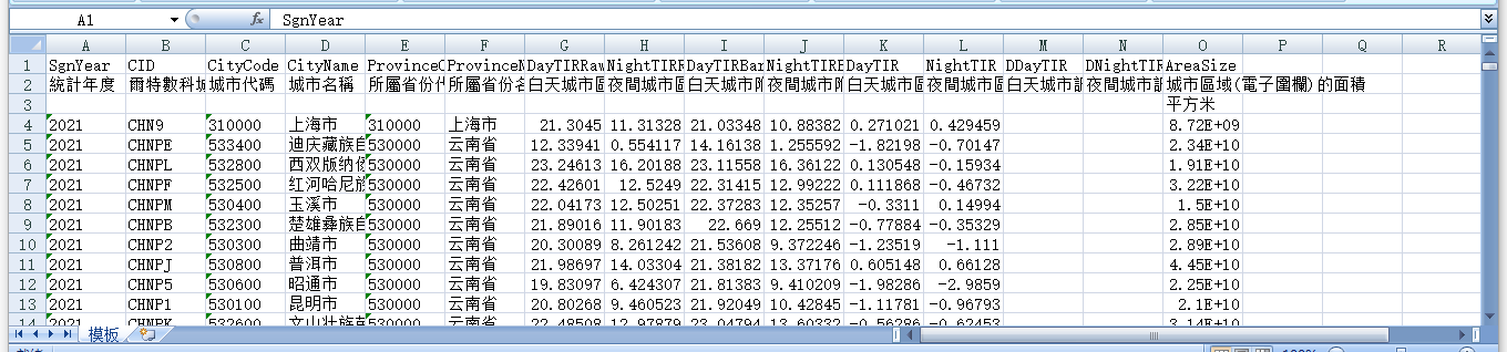 統計年度 爾特數科城市編碼 城市代碼 城市名稱 所屬省份代碼 所屬省份名稱 白天城市區域平均熱輻射 夜間城市區域平均熱輻射 白天城市附近5km範圍內平均熱輻射 夜間城市附近5km範圍內平均熱輻射 白天城市區域平均熱輻射-白天城市附近5km範圍內平均熱輻射 夜間城市區域平均熱輻射-夜間城市附近5km範圍內平均熱輻射 白天城市調整熱輻射同期變化 夜間城市調整熱輻射同期變化 城市區域(電子圍欄)的面積