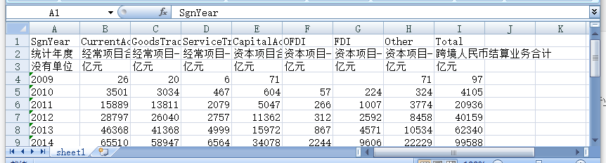 统计年度 经常项目合计 经常项目-货物贸易 经常项目-服务及其他经常项目 资本项目合计 资本项目-对外直接投资 资本项目-外商直接投资 资本项目-其他 跨境人民币结算业务合计