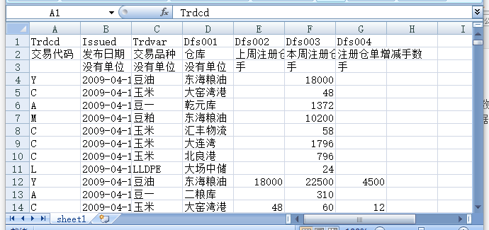 交易代码 发布日期 交易品种 仓库 上周注册仓单手数 本周注册仓单手数 注册仓单增减手数