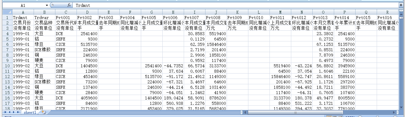 交易月份 交易品种 交易所代码 本月成交量 去年同期成交量 同比增减(%) 上月成交量 环比增减(%) 本月成交量占全国份额(%) 本月成交额 去年同期成交额 同比增减(%) 上月成交额 环比增减(%) 本月交易额占全国份额(%) 今年累计成交总量 去年同期成交总量 同比增减(%) 今年累计成交总量占全国份额(%) 今年累计成交总额 去年同期成交总额 同比增减(%) 今年累计成交总额占全国份额(%) 本月月末持仓量 本月月末持仓量占全国份额(%) 上月月末持仓量 环比增减(%)