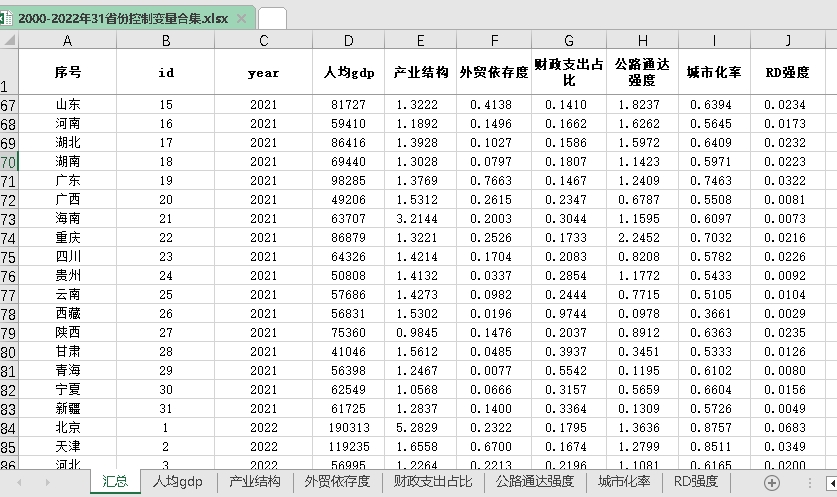 2000-2022年31省常见控制变量合集(七类控制变量)面板数据,具体包括人均gdp、产业结构、外贸依存度、财政支出占比、公路通达强度、城镇化率、金融存贷款余额占比以及RD强度数据,包括原始数据和计算过程,数据来源:国家统计年鉴、科技统计年鉴以及各省统计公报。