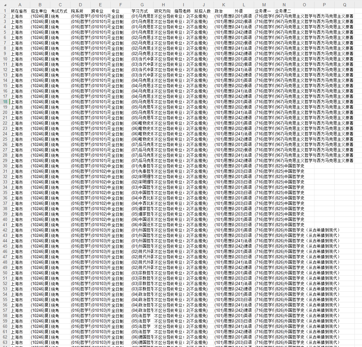 3.数据指标:所在省市 招生单位 考试方式 院系所 跨专业 专业 学习方式 研究方向 指导老师 拟招人数 政治 外语 业务课一 业务课二