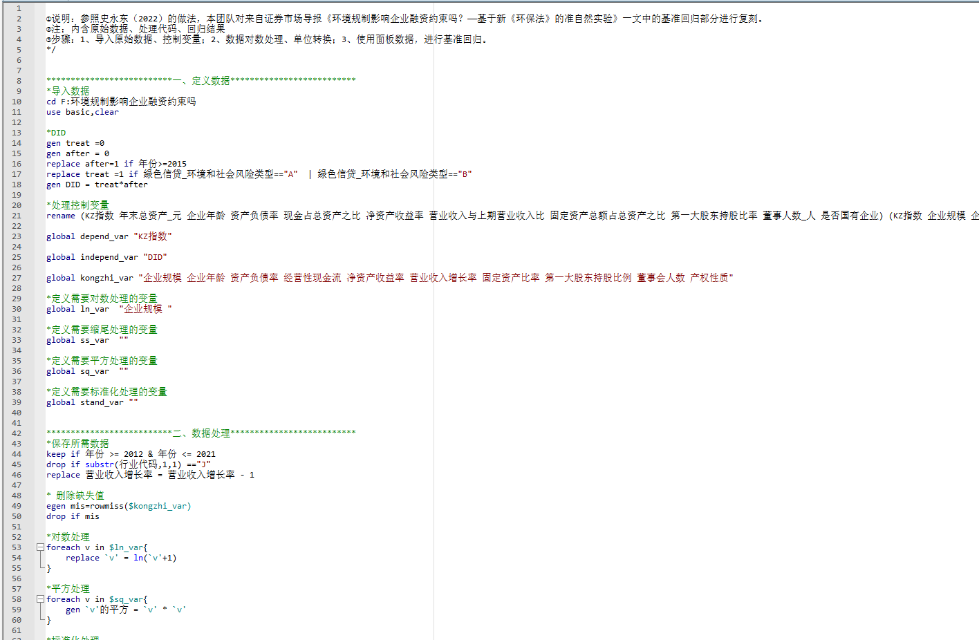 1.资料名称:2021-2012年环境规制影响企业融资约束吗——基于新《环保法》的准自然实验,对基本回归做论文复刻