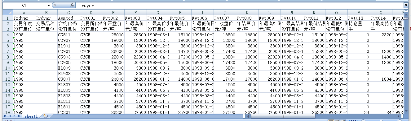 商品期货期货年交易数据1998-2023年开盘价年最高价年最高价发生日年最低价年最低价日年收盘价年结算价年最高结算价年最高结算价发生日年最低结算价