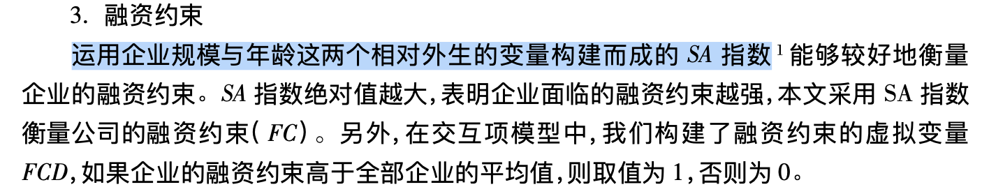上市公司融资约束指数,是用来评估公司面临的融资限制程度的工具。SA指数由Hadlock和Pierce开发,基于公司规模和年龄计算,其中较小且较年轻的公司通常会有更高的指数值,表明其融资约束较大。另一方面,WW指数由Whited和Wu提出,通过多个财务指标综合评估公司的融资约束。