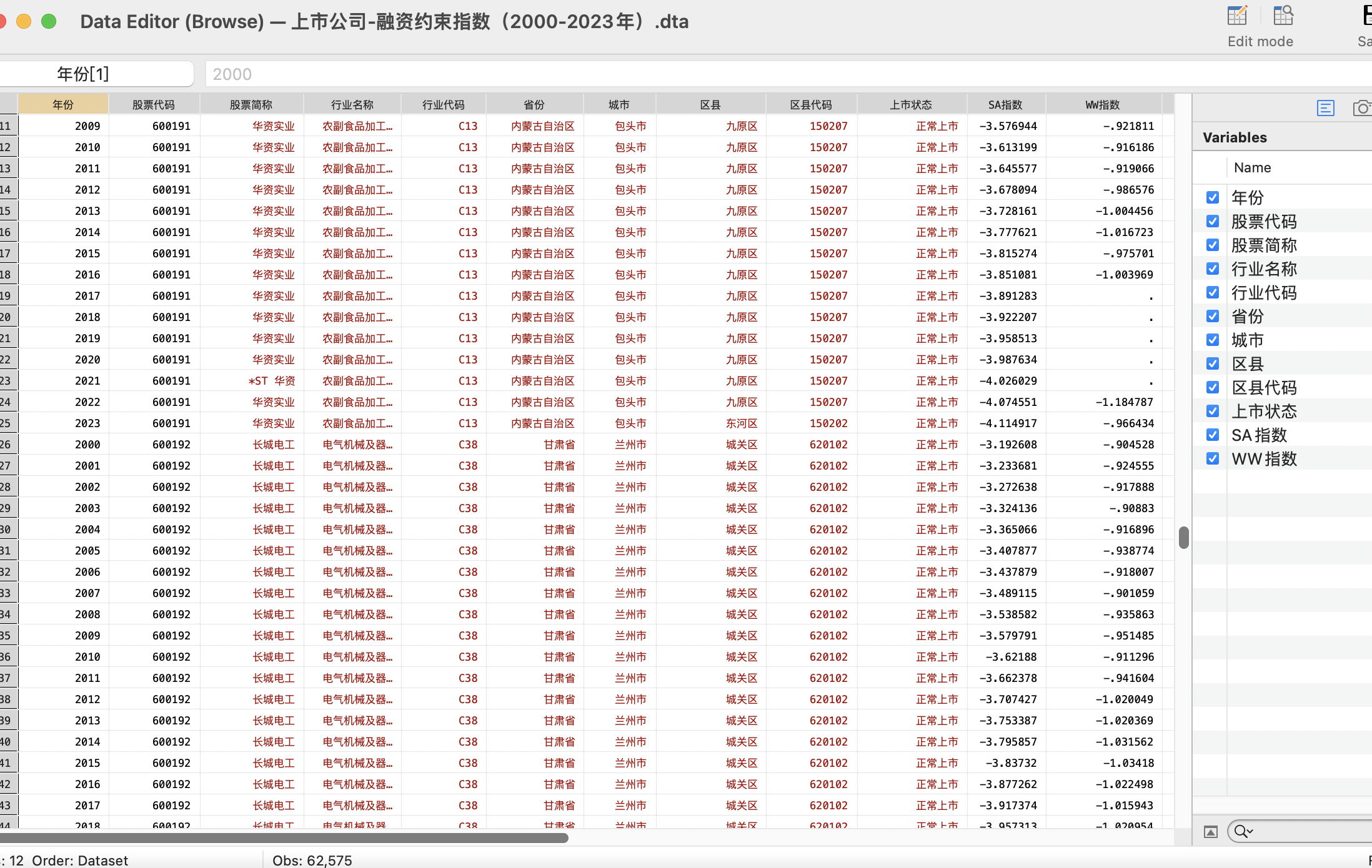 数据名称:A股上市公司融资约束指数数据上市公司SA指数WW指数