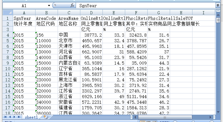 统计年度 地区代码 地区名称 网上零售额 网上零售额增长 其中:实物商品网上零售额 实物商品网上零售额增长