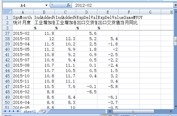统计月度 工业增加值累计值同比 工业增加值当月同比 出口交货值累计值同比 出口交货值当月同比
