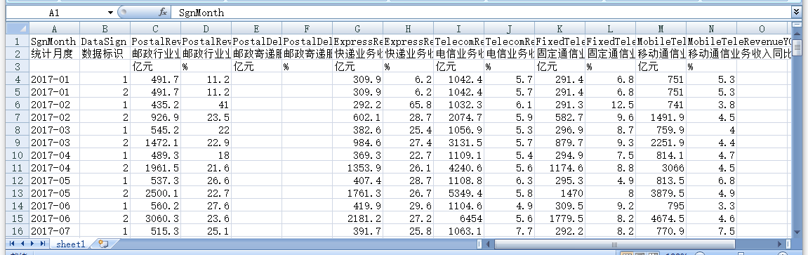 统计月度 数据标识 邮政行业业务收入 邮政行业业务收入同比增长 邮政寄递服务收入 邮政寄递服务收入同比增长 快递业务收入 快递业务收入同比增长 电信业务收入 电信业务收入同比增长 固定通信业务收入 固定通信业务收入同比增长 移动通信业务收入 移动通信业务收入同比增长