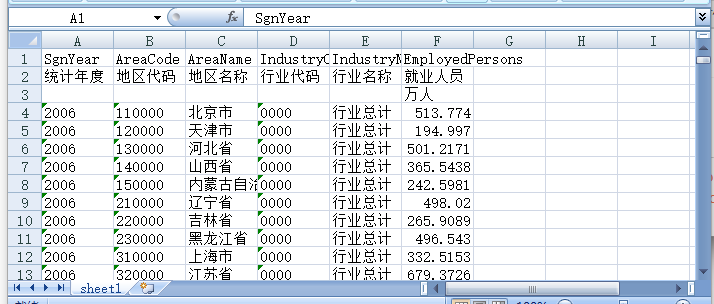 统计年度 地区代码 地区名称 行业代码 行业名称 就业人员