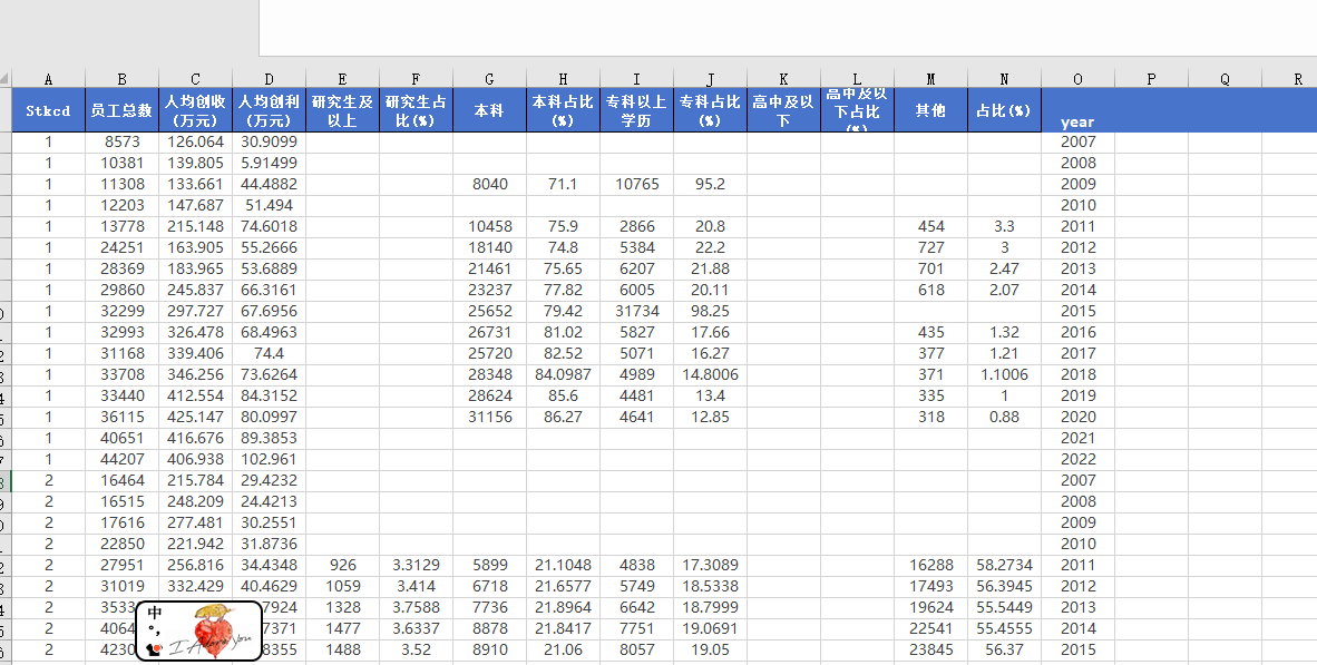 数据介绍:全国上市公司员工构成情况包括员工学历,以及学历占比,职能占比等,员工数量,单位员工创利创收等数据,构建企业员工教育水平和工种构成,为广大研究学者提供数据支撑,有关企业人力资本影响因素和经济后果等方面研究。