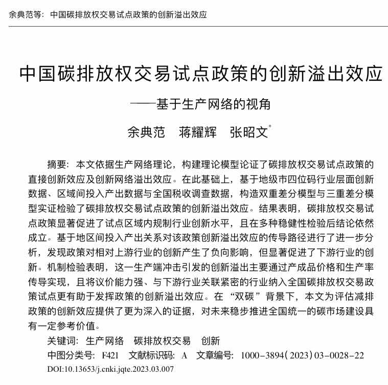 余典范等:中国碳排放权交易试点政策的创新溢出效应