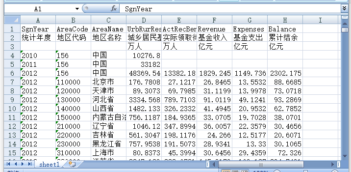 统计年度 地区代码 地区名称 城乡居民基本养老保险参保人数 实际领取待遇人数 基金收入 基金支出 累计结余