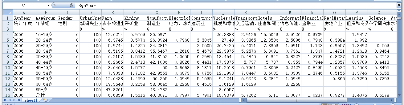 统计年度 年龄组 性别 城镇失业人员 农林牧渔业 采矿业 制造业 电力、热力、燃气及水生产和供应业 建筑业 批发和零售业 交通运输、仓储和邮政业 住宿和餐饮业 信息传输、软件和信息技术服务业 金融业 房地产业 租赁和商务服务业 科学研究和技术服务业 水利、环境和公共设施管理业 居民服务、修理和其他服务业 教育 卫生和社会工作 文化、体育和娱乐业 公共管理、社会保障和社会组织 国际组织