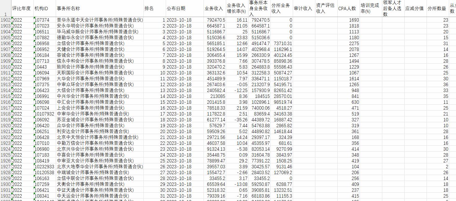 | 评比年度 | 机构ID | 事务所名称 | 排名 | 公布日期 | 业务收入 | 业务收入增长率(%) | 事务所本身业务收入 | CPA人数 | 分所数量 | 综合得分 |