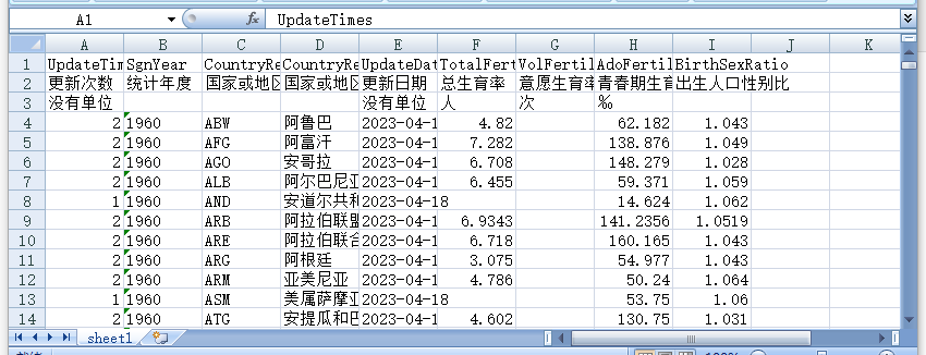 更新次数 统计年度 国家或地区代码 国家或地区名称 更新日期 总生育率 意愿生育率 青春期生育率 出生人口性别比