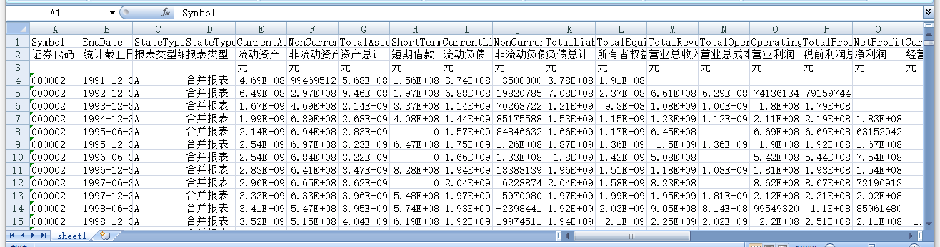 证券代码 统计截止日期 报表类型编码 报表类型 流动资产 非流动资产 资产总计 短期借款 流动负债 非流动负债 负债总计 所有者权益 营业总收入 营业总成本 营业利润 税前利润总额 净利润 经营活动产生的现金流量净额 投资活动产生的现金流量净额 筹资活动产生的现金流量净额 基本每股收益 稀释每股收益 扣除非经常性损益后的基本每股收益 扣除非经常性损益后的加权平均净资产收益率 总资产净利润率(ROA)A 总资产净利润率(ROA)B 总资产净利润率(ROA)C 净资产收益率A 净资产收益率B 净资产收益率C 投资收益率 营运指数 市盈率1 市盈率2 市净率 市值A 市值B 账面市值比A 账面市值比B 托宾Q值A 托宾Q值B 托宾Q值C 托宾Q值D 息税前利润 息税折旧摊销前收入 主营业务收入 每股经营活动产生的现金流量净额 每股净资产
