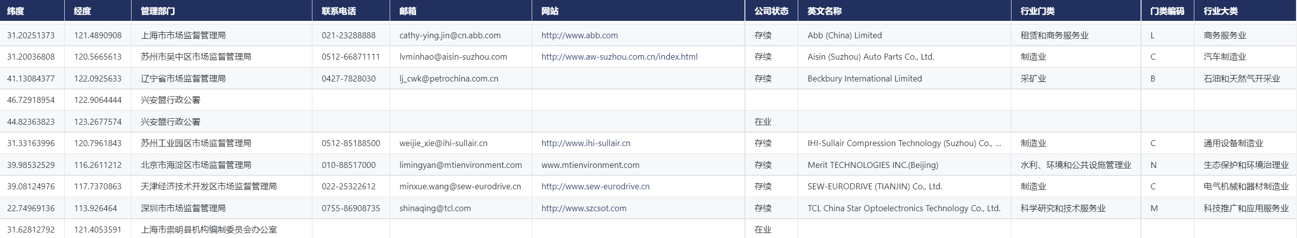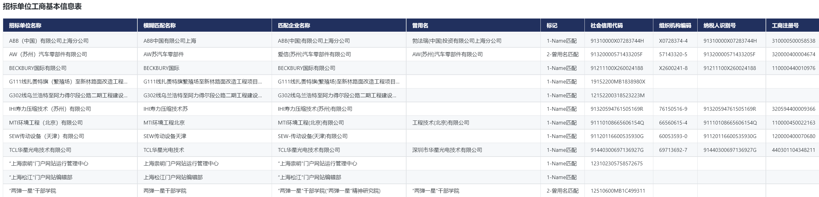 根据中国各地区招投标数据中的招标单位及中标单位匹配最新年份工商得出了中国各地区招投标单位基本信息扩展数据,该数据包含了截至最新年份招标单位、中标单位的基本信息及股东信息内容,如纳税人识别号、企业地址、注册资本、注册时间、行业信息、经纬度、经营范围、股东名称、持股比例、认缴出资额比例、股东类型等。