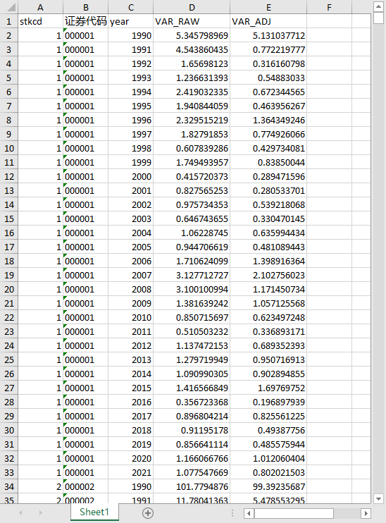 数据中包含的信息为股票代码、年份、当年交易日、股价波动率
