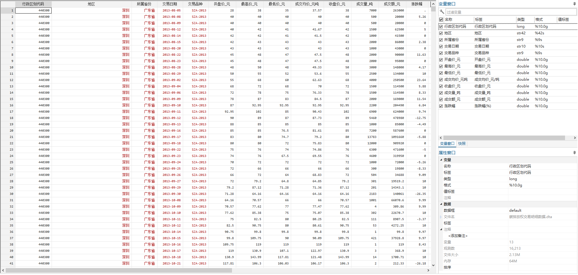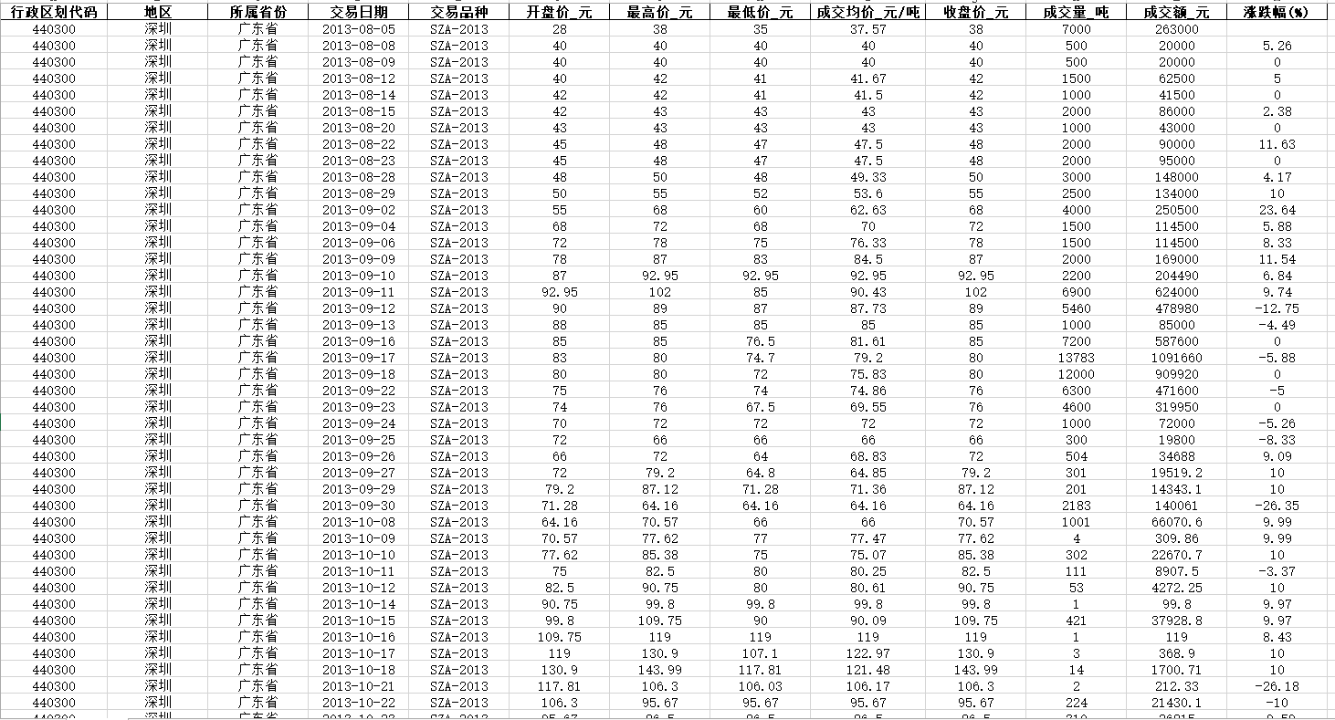 2013-2024年碳排放交易权明细开盘价收盘价成交价成交量成交额涨跌幅等excel+dta