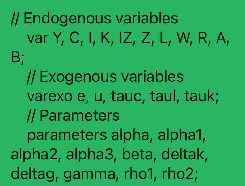 根据你给出的信息,模型涉及到了一些关键变量和参数,比如消费、投资、劳动力供给、利率、价格水平、技术冲击等等。11个等式可能是这些变量在DSGE模型中的动态均衡关系。