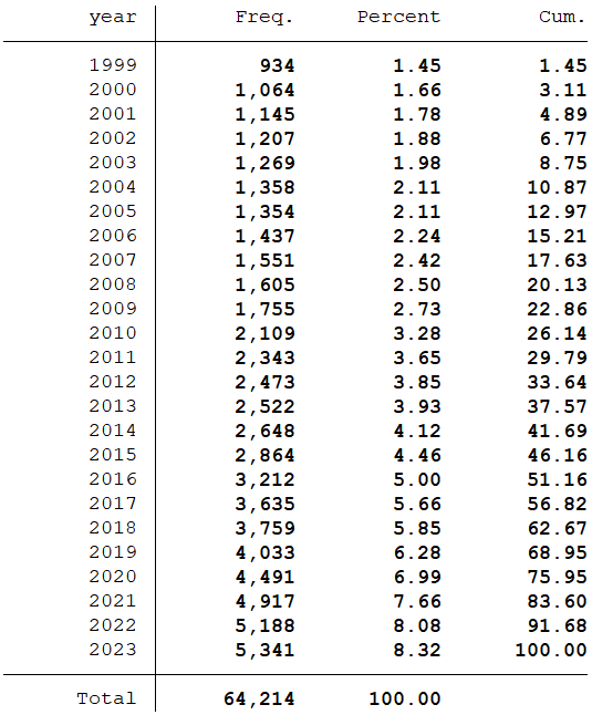 样本选择:全部A股1999-2023年数据(“员工人数”在数据库中是从1999年开始,所以数据起点为1999年)
