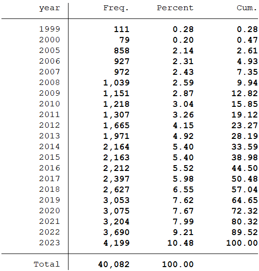 样本选择:全部A股1999-2023年数据(“员工人数”数据是从1999年开始,所以数据起点选择为1999年)
