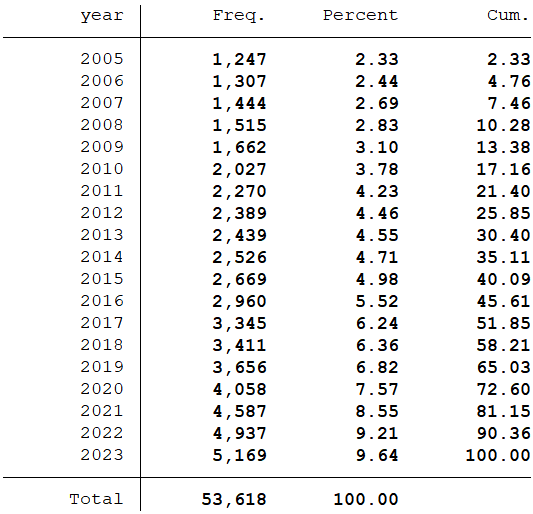 样本选择:全部A股2005-2023年数据(“高管薪酬比例表年”文件在数据库中是从2005年开始,所以数据起点选择为2013年)