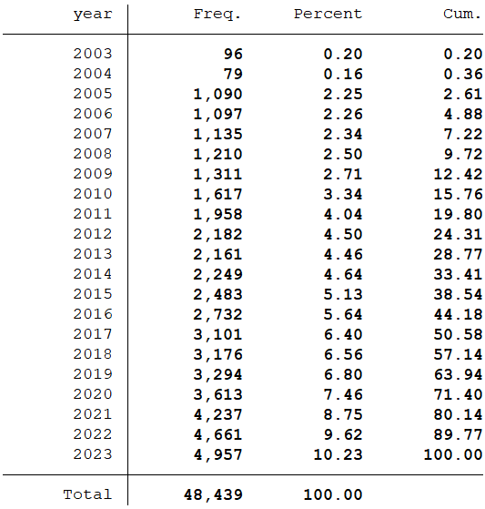 样本选择:全部A股2003-2023年数据(“股权制衡度”数据是从2003年开始,所以数据起点选择为2003年)