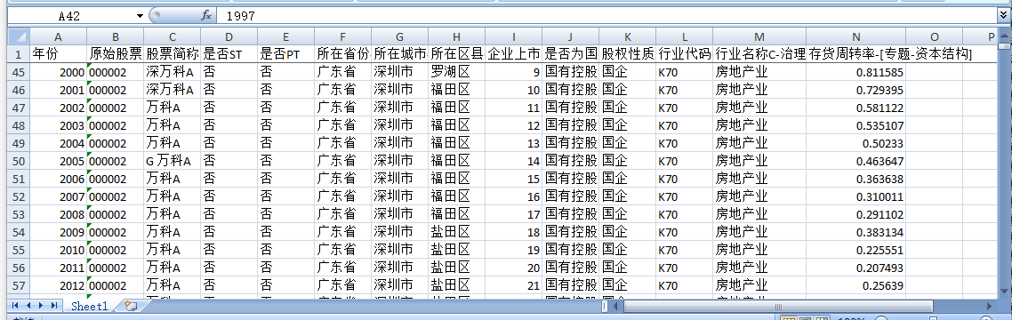 年份 原始股票代码 股票简称 是否ST 是否PT 所在省份-注册地详细 所在城市-注册地详细 所在区县-注册地详细 企业上市年龄 是否为国有控股-依据实际控制人性质筛选-股东子库 股权性质 行业代码C-治理结构子库 行业名称C-治理结构子库 存货周转率-[专题-资本结构]