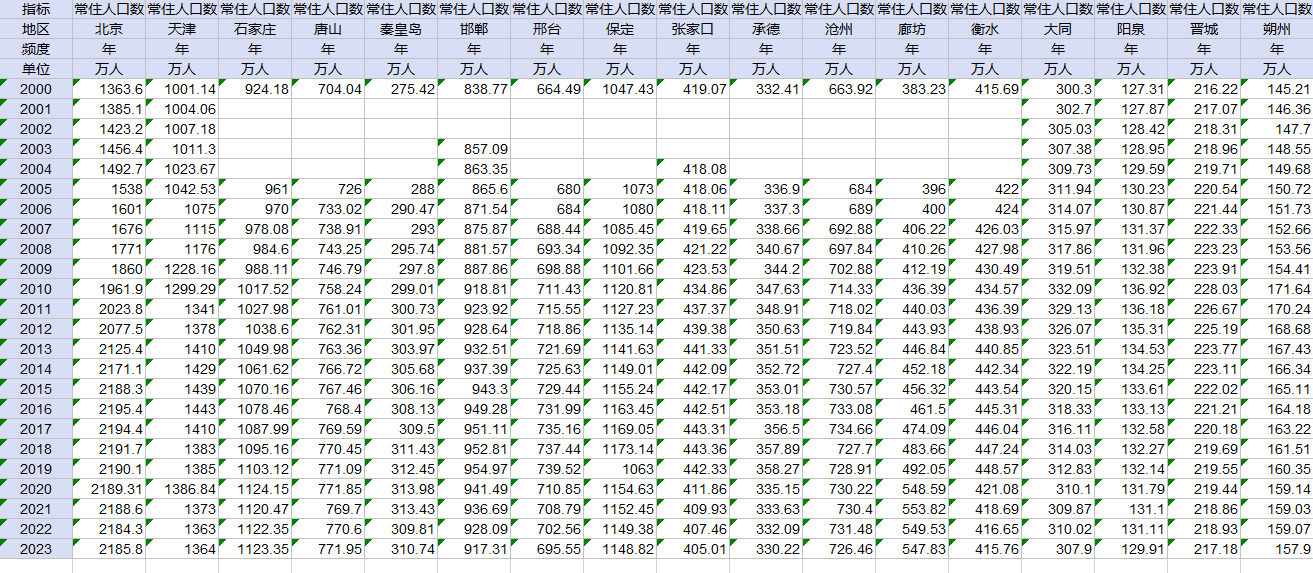 对于吉林省,黑龙江等缺值较多的地区,我的建议是用人均GDP=GDP/常住人口数 计算得到常住人口数。这样子补充缺值的依据,您可以引用 [1]蔡庆丰,王仕捷,刘昊,等.城市群人口集聚促进域内企业创新吗[J].中国工业经济,2023(03):152-170. 这条文献进行说明