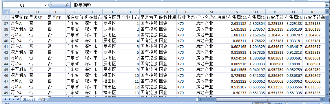 年份 原始股票代码 股票简称 是否ST 是否PT 所在省份-注册地详细 所在城市-注册地详细 所在区县-注册地详细 企业上市年龄 是否为国有控股-依据实际控制人性质筛选-股东子库 股权性质 行业代码C-治理结构子库 行业名称C-治理结构子库 存货周转天数A 存货周转天数B 存货周转天数C 存货周转天数TTM