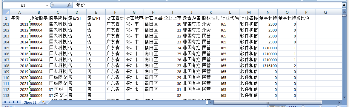 年份 原始股票代码 股票简称 是否ST 是否PT 所在省份-注册地详细 所在城市-注册地详细 所在区县-注册地详细 企业上市年龄 是否为国有控股-依据实际控制人性质筛选-股东子库 股权性质 行业代码C-治理结构子库 行业名称C-治理结构子库 董事长持股数量 董事长持股比例
