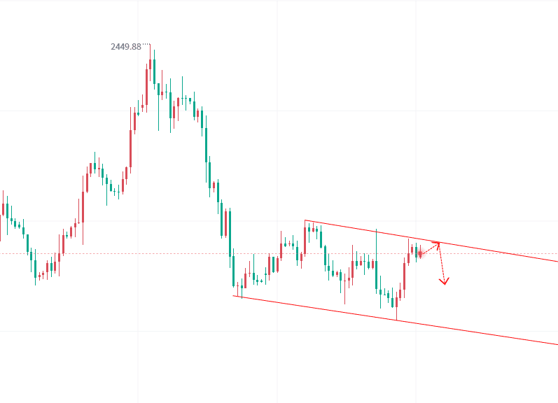 4小时图来看,低点不断的下移,而高点也是同部向下,从2450美元起跌以来,只是这段时间不是极弱的单边,而是阶梯式的震荡向下,整体行情结构没有变化,也没有改变,就等着一个关键性的数据作为导火索点爆。
