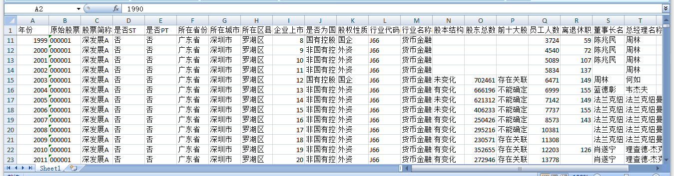 还包含各个上市公司股票的、多年度的