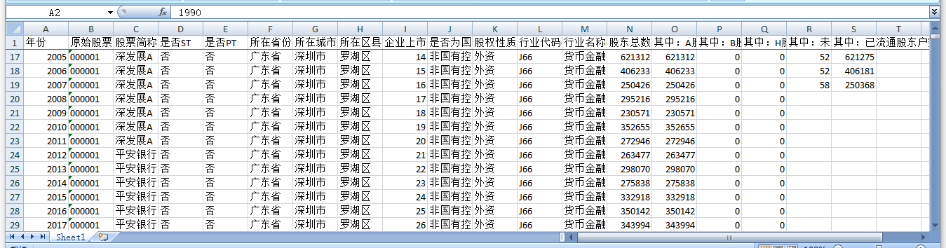 年份 原始股票代码 股票简称 是否ST 是否PT 所在省份-注册地详细 所在城市-注册地详细 所在区县-注册地详细 企业上市年龄 是否为国有控股-依据实际控制人性质筛选-股东子库 股权性质 行业代码C-治理结构子库 行业名称C-治理结构子库 股东总数 其中:A股股东总数 其中:B股股东总数 其中:H股股东总数 其中:未流通股东户数 其中:已流通股东户数