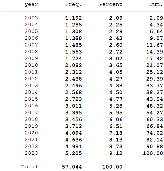 样本选择:全部A股2003-2023年数据(“第一大股东持股比例”和“第二至十大股东持股比例之和”数据是从2003年开始,所以数据起点选择为2003年)