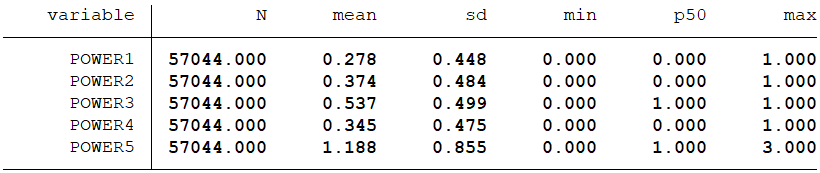 结合我国的实际, 本研究拟先按照两职兼任(POWER1) 、股权分散(POWER2) 、高管长期在位(POWER3) 分别定义三个单一维度的管理层权力, 然后将这三个单维度变量合成构建反映管理层权力的综合变量(包括一个虚拟变量POWER4 和一个积分变量POWER5) 。