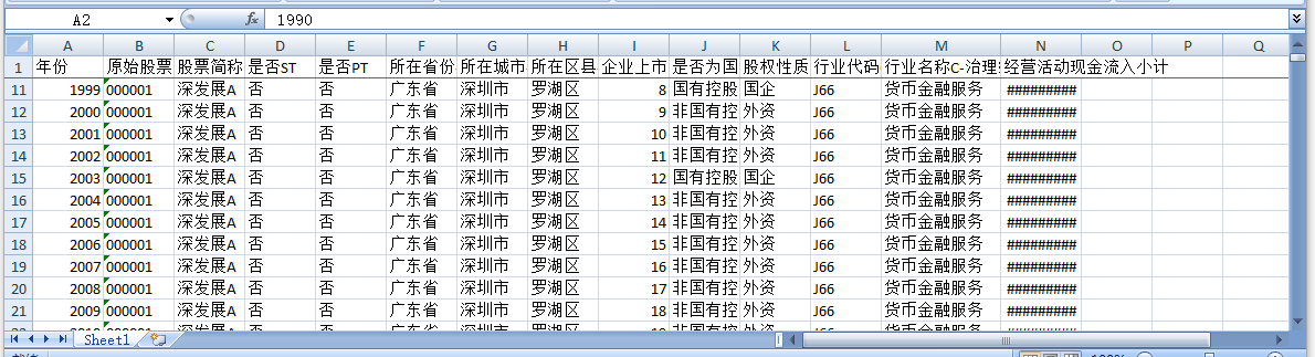 年份 原始股票代码 股票简称 是否ST 是否PT 所在省份-注册地详细 所在城市-注册地详细 所在区县-注册地详细 企业上市年龄 是否为国有控股-依据实际控制人性质筛选-股东子库 股权性质 行业代码C-治理结构子库 行业名称C-治理结构子库 经营活动现金流入小计