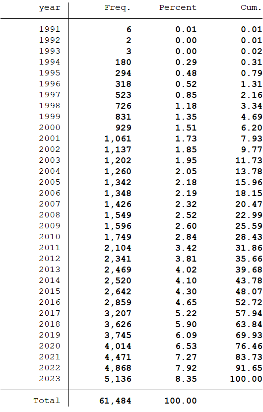 样本选择:全部A股1990-2023年数据(初始数据是从1990年开始,经过处理后的数据起点为1991年)