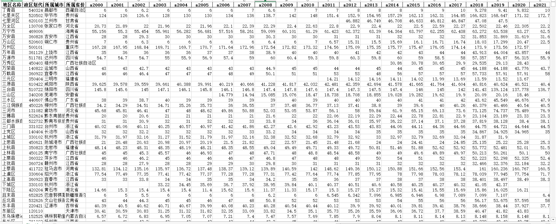 ③需要注明的是行政区划代码在2000-2024年间存在变动,所以Excel数据统一链接到2021年行政区划的Shp文件时,会存在极少数县(市)的部分年份的数据因为行政区划代码不对应而导致数据丢失的情况。