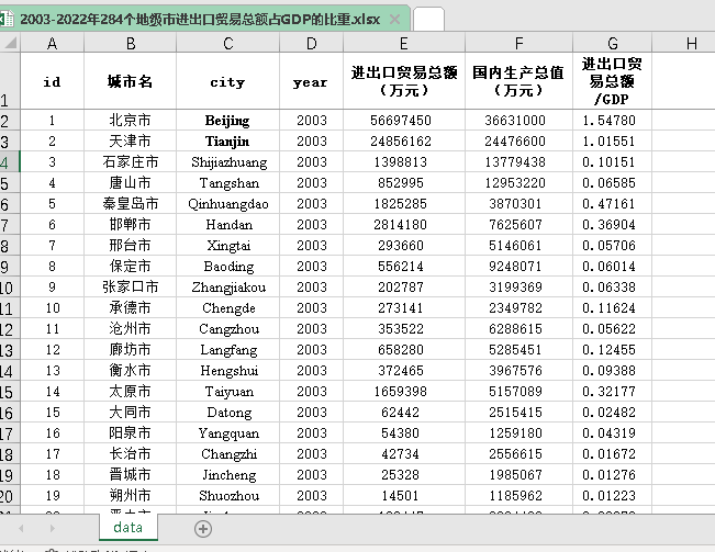 2003-2022年284个地级市进出口贸易总额占GDP的比重.xlsx