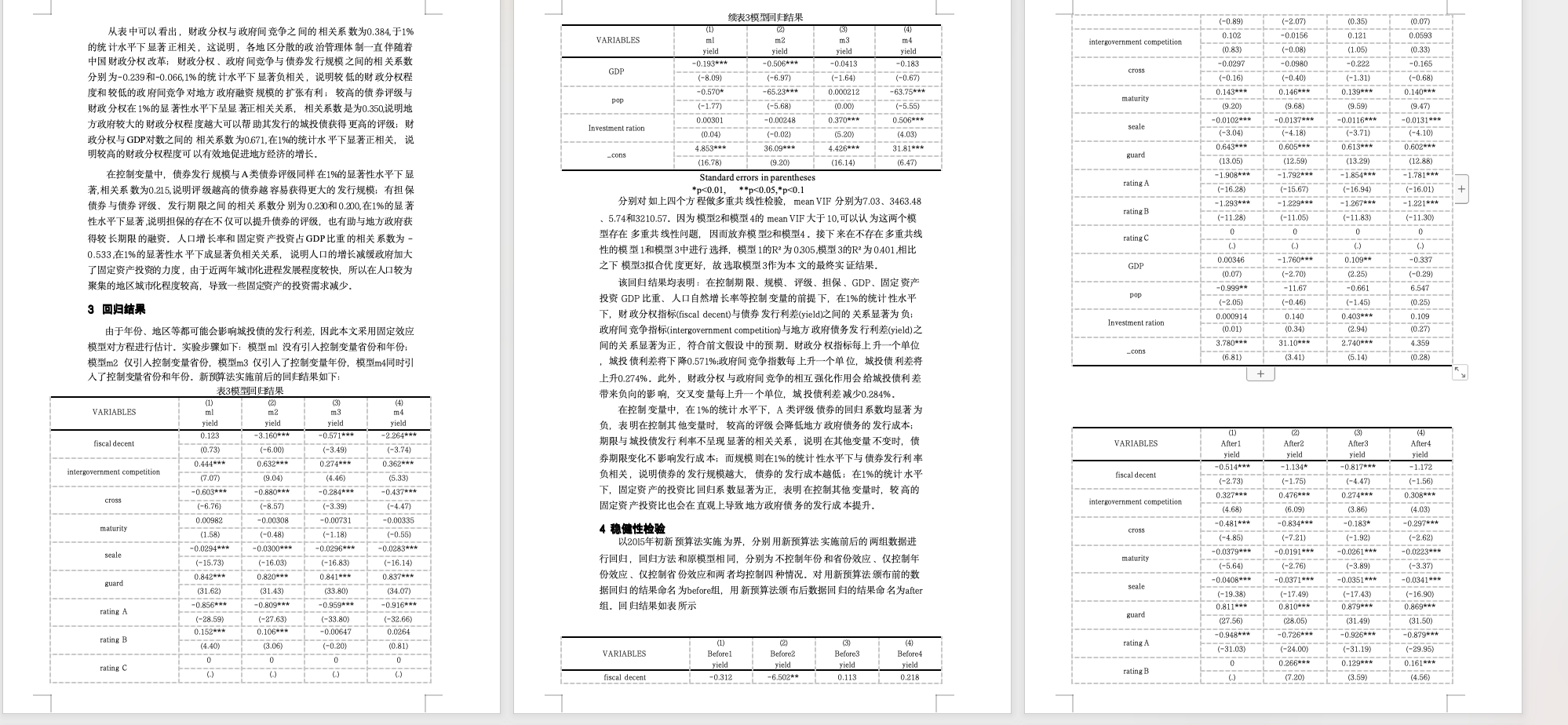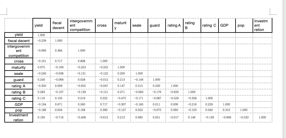 为了准确描述样本特征,本文在表5.1 中列出了主要变量的描述性统计。各省 市所发行的城投债与同期一年期限银行存款利率的利差最大为8.15%,最小值为 0.530%,中位数为和均值分别为3.500%和3.583%,标准差为1.236%。同时,财 政分权指数 fiscal decent 最大值为0.898,最小值为0.174,中位数为0.678,均值 为0.634,标准差为0.187;ZF间竞争指数最大值为3,最小值为0,中位数为2, 均值为1.862,标准差为0.759。说明不同省份间财政分权和ZF间竞争指数有所不同