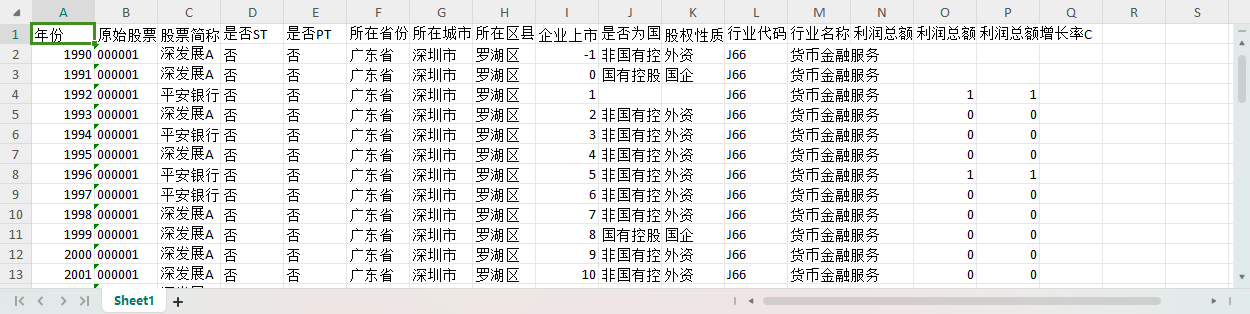 年份 原始股票代码 股票简称 是否ST 是否PT 所在省份-注册地详细 所在城市-注册地详细 所在区县-注册地详细 企业上市年龄 是否为国有控股-依据实际控制人性质筛选-股东子库 股权性质 行业代码C-治理结构子库 行业名称C-治理结构子库 利润总额增长率A 利润总额增长率B 利润总额增长率C