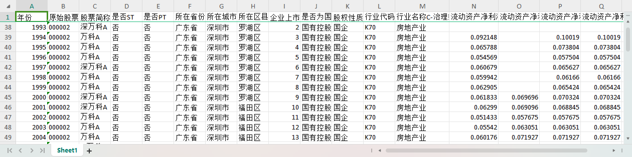年份 原始股票代码 股票简称 是否ST 是否PT 所在省份-注册地详细 所在城市-注册地详细 所在区县-注册地详细 企业上市年龄 是否为国有控股-依据实际控制人性质筛选-股东子库 股权性质 行业代码C-治理结构子库 行业名称C-治理结构子库 流动资产净利润率A 流动资产净利润率B 流动资产净利润率C 流动资产净利润率TTM