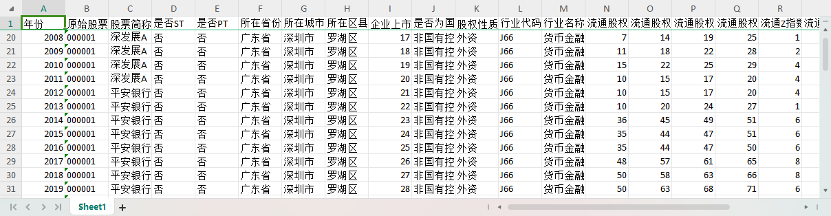 年份 原始股票代码 股票简称 是否ST 是否PT 所在省份-注册地详细 所在城市-注册地详细 所在区县-注册地详细 企业上市年龄 是否为国有控股-依据实际控制人性质筛选-股东子库 股权性质 行业代码C-治理结构子库 行业名称C-治理结构子库 流通股权集中指标1(%)-公司第一大流通股股东持股比例 流通股权集中指标2(%)-公司前3位流通股股东持股比例之和 流通股权集中指标3(%)-公司前5位流通股股东持股比例之和 流通股权集中指标4(%)-公司前10位流通股股东持股比例之和 流通Z指数-公司第一大流通股股东与第二大流通股股东持股比例的比值 流通S指数(%)-公司第二大流通股股东至第十大流通股股东持股比例之和 流通H指数-第一大流通股股东持股比例的平方和 流通Herfindahl_3指数-公司前3位流通股股东持股比例的平方和 流通Herfindahl_5指数-公司前5位流通股股东持股比例的平方和 流通Herfindahl_10指数-公司前10位流通股股东持股比例的平方和