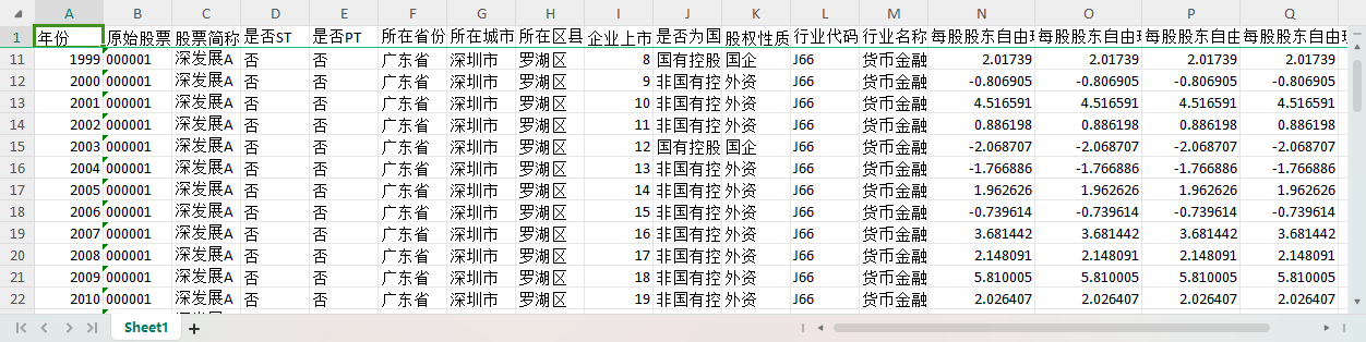 年份 原始股票代码 股票简称 是否ST 是否PT 所在省份-注册地详细 所在城市-注册地详细 所在区县-注册地详细 企业上市年龄 是否为国有控股-依据实际控制人性质筛选-股东子库 股权性质 行业代码C-治理结构子库 行业名称C-治理结构子库 每股股东自由现金流量1 每股股东自由现金流量TTM1 每股股东自由现金流量2 每股股东自由现金流量TTM2