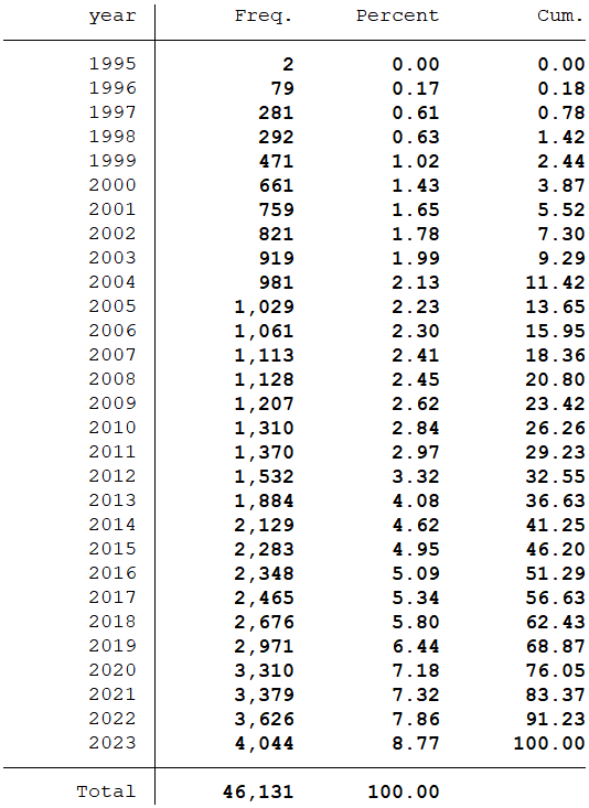 样本选择:全部A股1995-2023年数据(初始数据是从1990年开始,经过处理之后的数据起点为1995年)
