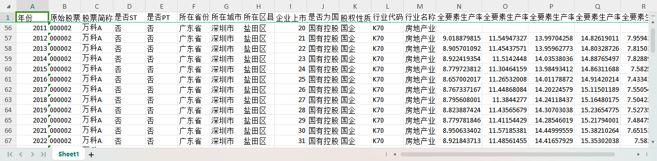年份 原始股票代码 股票简称 是否ST 是否PT 所在省份-注册地详细 所在城市-注册地详细 所在区县-注册地详细 企业上市年龄 是否为国有控股-依据实际控制人性质筛选-股东子库 股权性质 行业代码C-治理结构子库 行业名称C-治理结构子库 全要素生产率OP方法 全要素生产率LP方法 全要素生产率OLS方法 全要素生产率FE方法 全要素生产率GMM方法