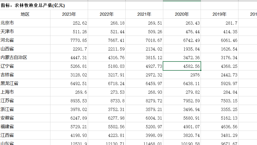 1、 时间:1996-2023年2、 来源:国家统计局、统计年鉴3、 指标:农林牧渔总产值4、 范围:31省